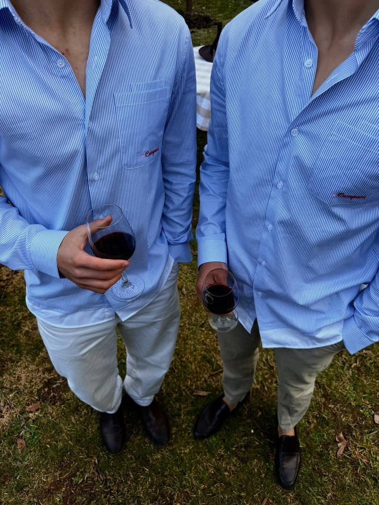 Campani first product release occurred on the 28th of August 2025. The Date Night Shirt includes a wide double left pocket with our 'Campani' logo underneath in rose pink and crimson red. The shirt also has a small wine glass emblem on the left cuff link to highlight the small details Campani tirelessly works on.